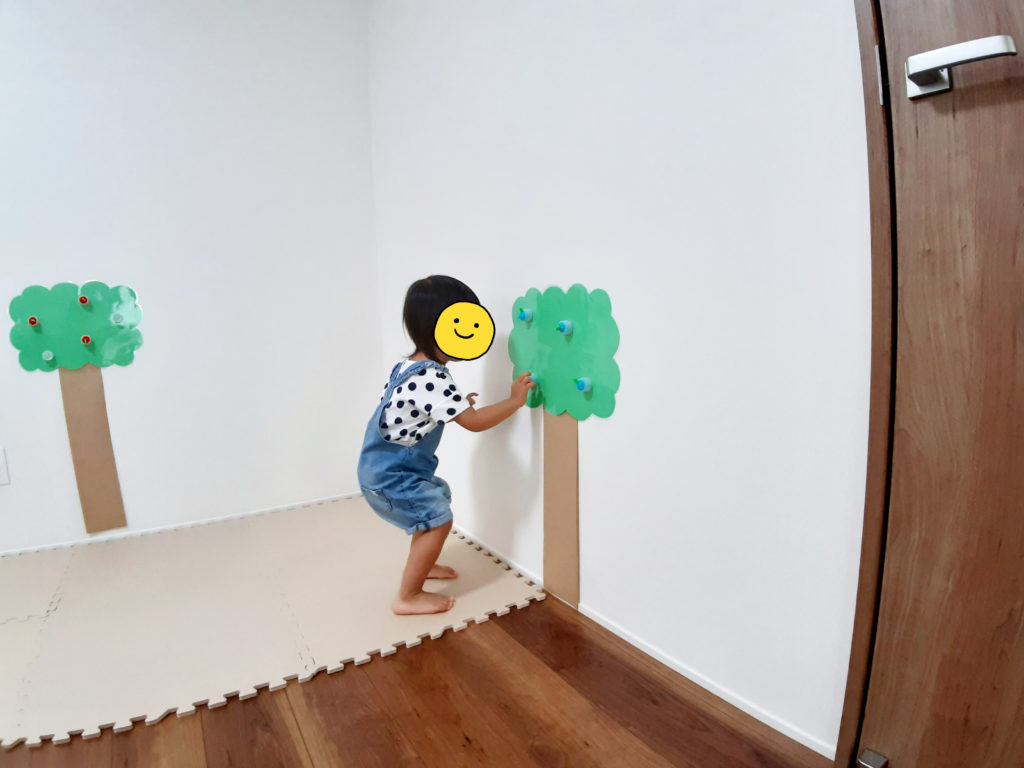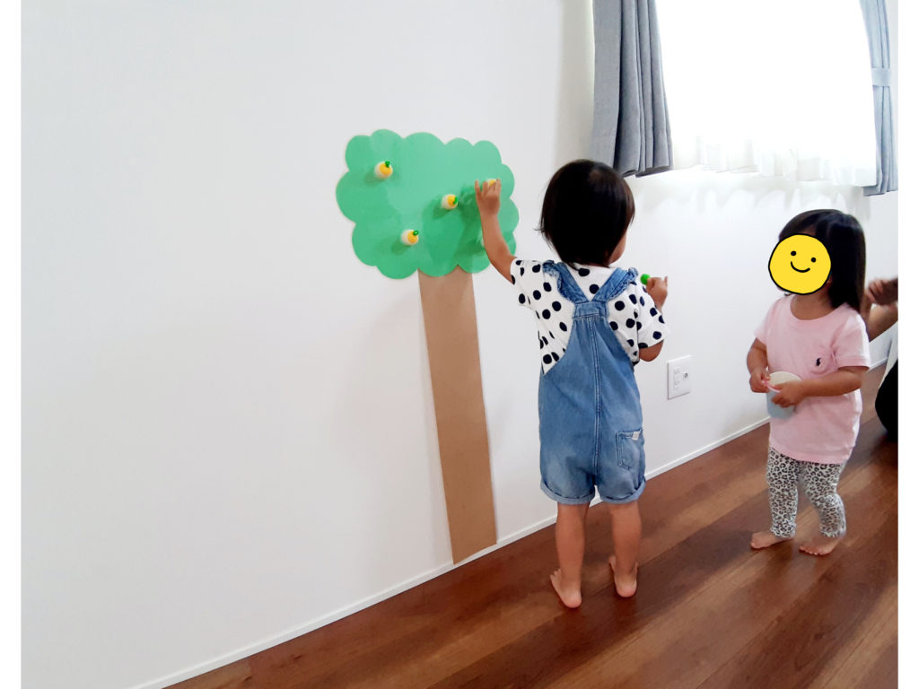 1歳児さん、小さいりんごをつまむことで手先の動きを鍛えます。