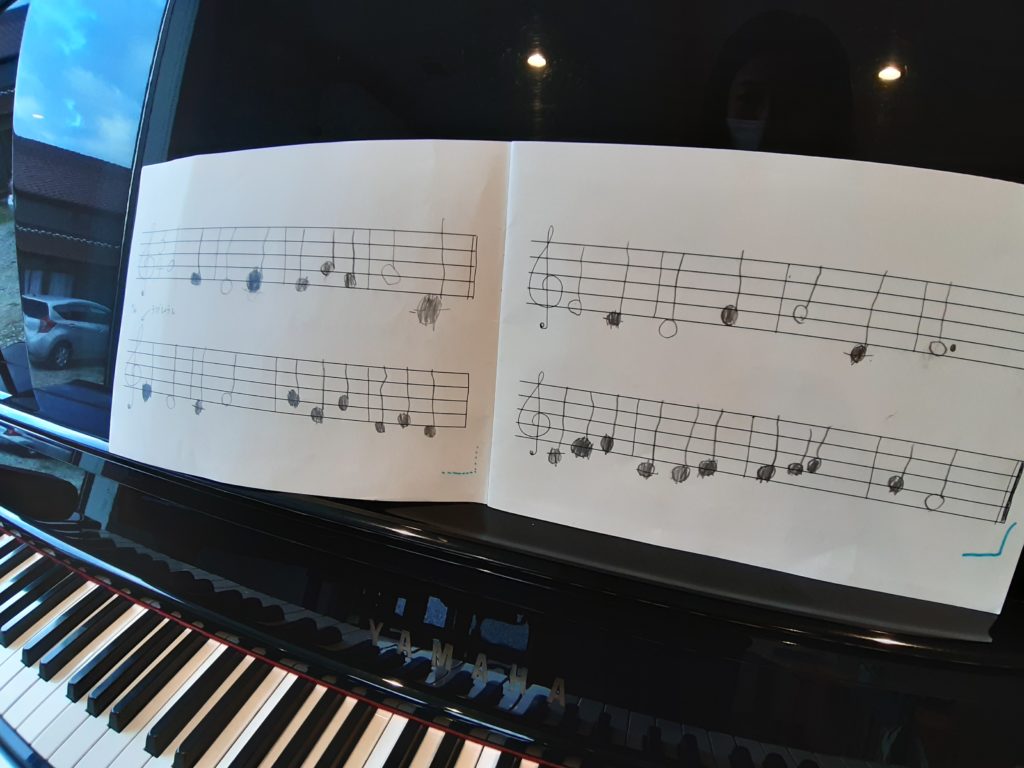 6歳の作曲家 ブログ 2021.10.14 ピアノを始めて半年のKくんが曲を作ってきてくれました。 最初は3拍子のリズム譜を作成してもらう予定でしたが、「音もつけよう!」と言ってスラスラとメロディーを描いていきます。 最後は先生と連弾をして完成! どんどんできることが増えていきますね。今後が楽しみです♪