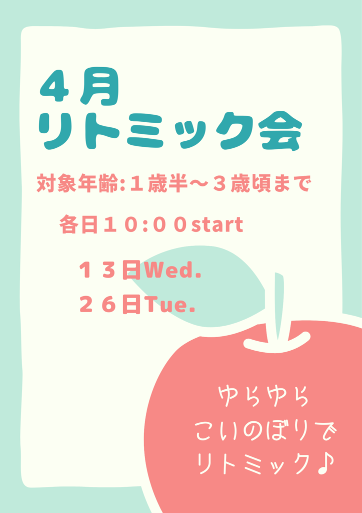 お好きな日程をお選びいただけるワンレッスン制のリトミック会について、4月の日程をお知らせいたします。